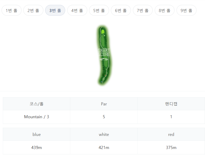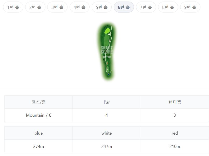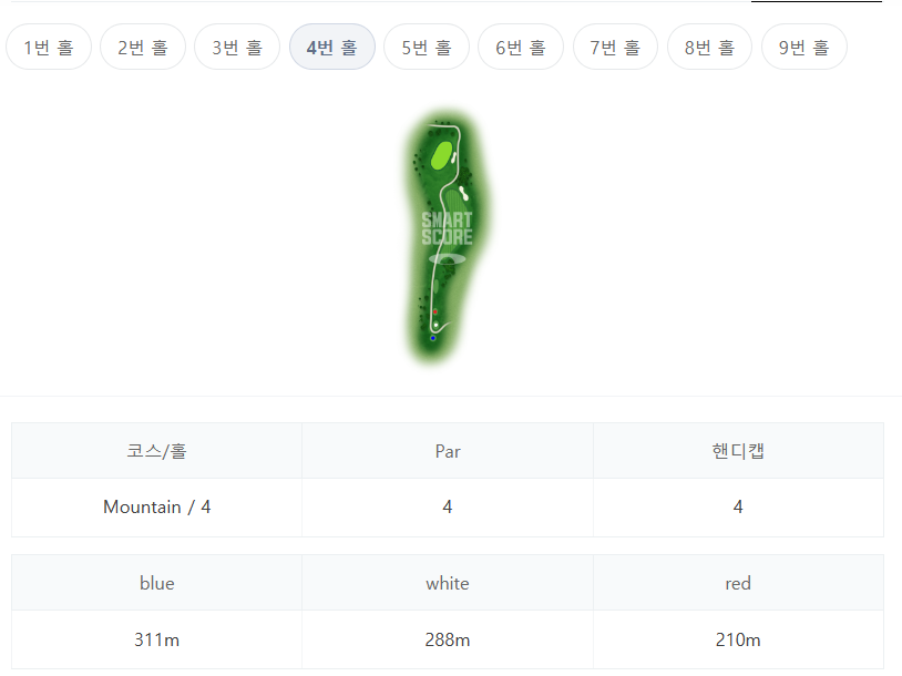 오르막이나 짧은 PAR4홀로 드라이버 티샷만 잘하면 어프로치 안쪽으로 거리가 남음. (오른쪽으로 볼 경우 카트도로 맞고 밑으로 흘러 내려오는 경우가 많으니 살짝 왼쪽 보고 티샷을 추천)