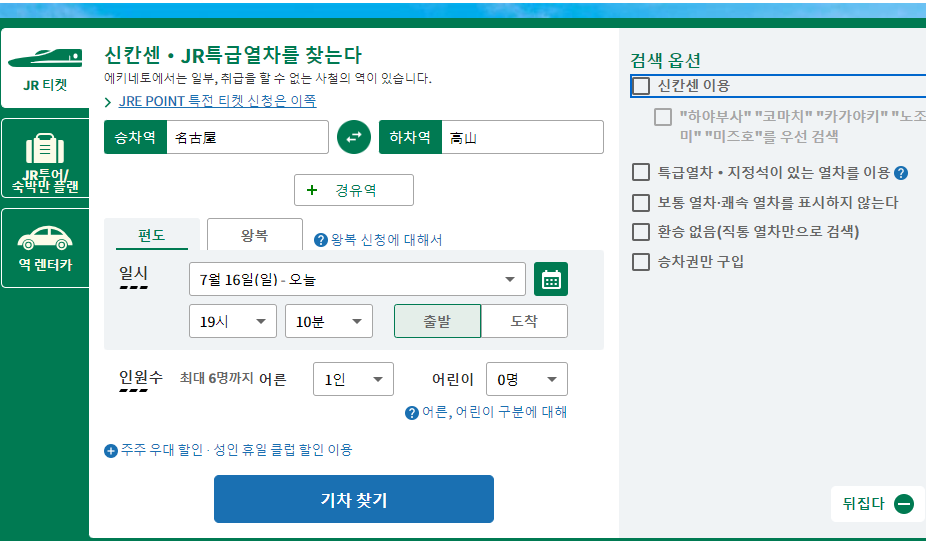 승차역 및 하차역을 영문으로 입력하면 한자로 나옵니다. 중요한 것은 하단에 검색 옵션+을 클릭하여 '신칸센 이용'을 해제해야 합니다. (나고야 <> 타카야마는 히다 train인데 해제를 안 하면 검색이 안 나옵니다.) 기차 찾기를 누릅니다.