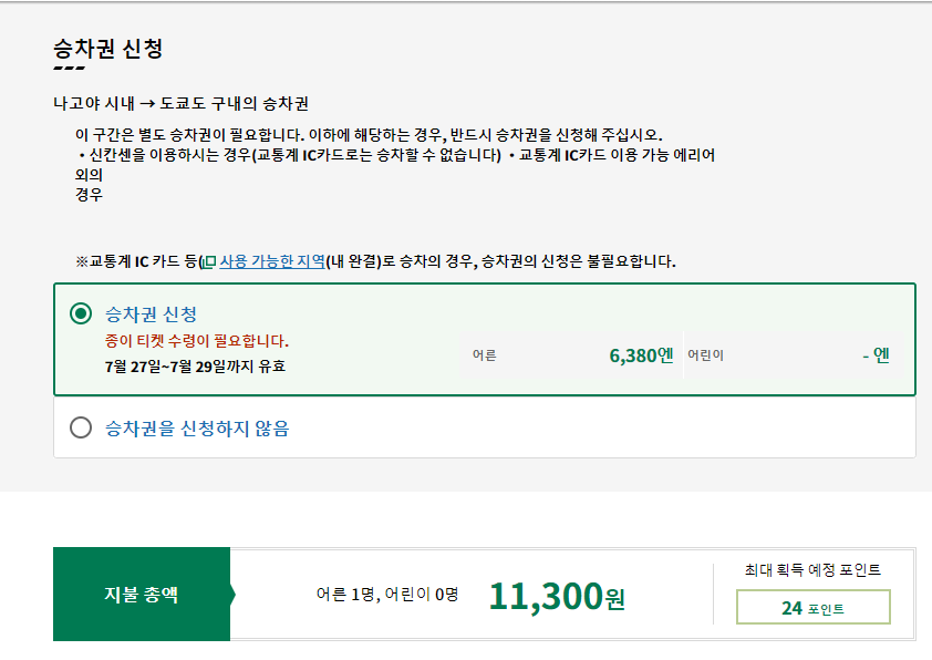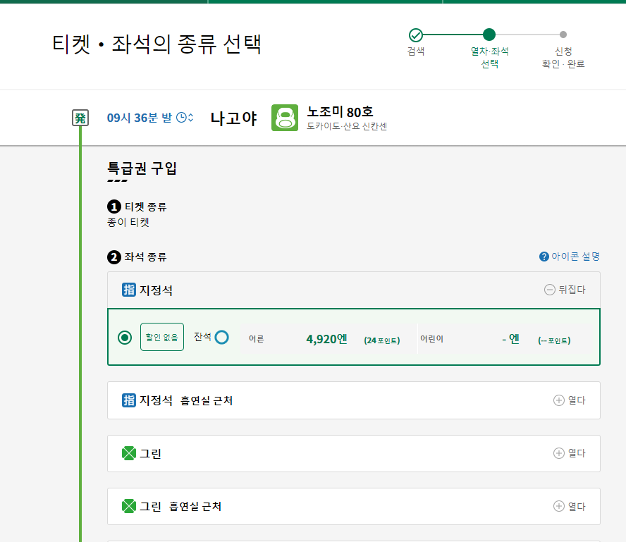 이용 가능한 기차 시간이 나오며 해당 시간으 누르면 금액 확인이 가능합니다. 일본은 지정석, 승차권 2개를 모두 구입하셔야 하며, 그린은 KTX처럼 특실에 해당합니다. (지정석은 일반실)
