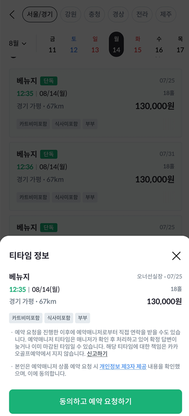 골프몬을 통한 예약의 단점은 가끔 티가 없는 경우에도 글을 내리지 않아 여러 매니저를 통해 확인해야 하는 번거로움이 있습니다. 카카오골프가 이 단점을 상쇄할 수 있을지 조금 더 사용해 봐야겠지만 초기 사용 시 답장 속도나 서비스 퀄리티 측면에서 더 좋았습니다.