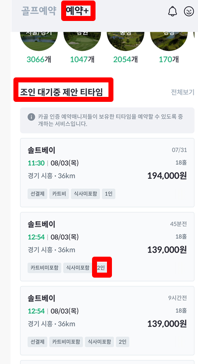 카카오골프예약 옆에 "예약+"라는 화면이 있고 거기에 보면 조인 대기 중 제안 티타임이 쭉 나옵니다. 옆에 전체 보기를 클릭하면 됩니다.