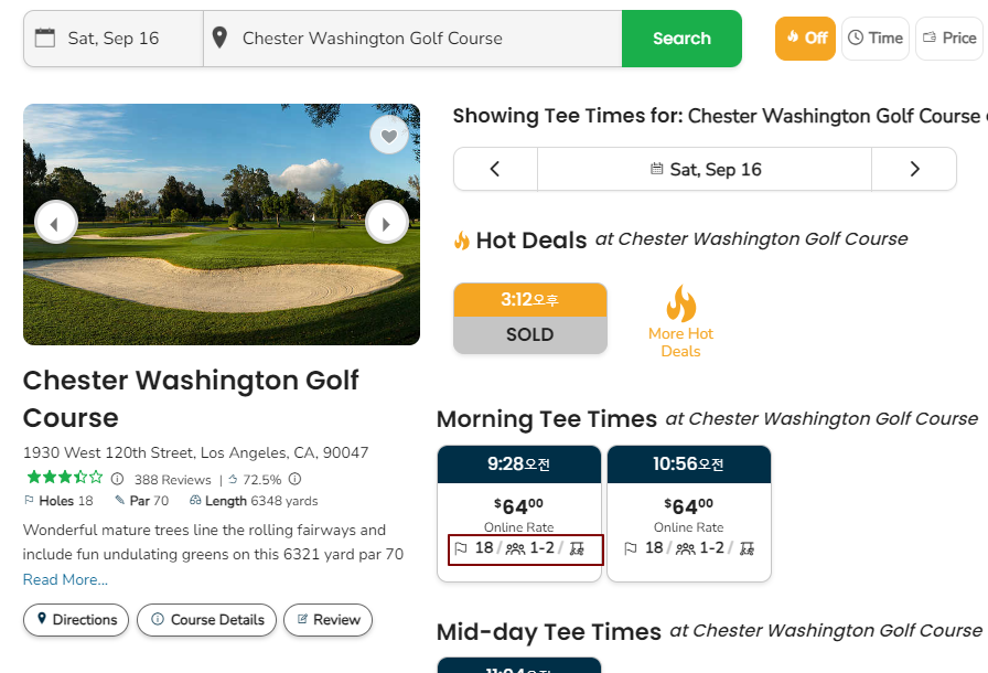 부킹 가능한 시간대가 나오며 같은 시간에 부킹한 사람들이 모여 같이 조인하여 플레이하는 형태입니다. (한국은 부킹매니저가 조인 예약을 진행해주는데 아래 사이트에서 빠르게 잔여 티 확인이 가능하니 매우 편리합니다.)