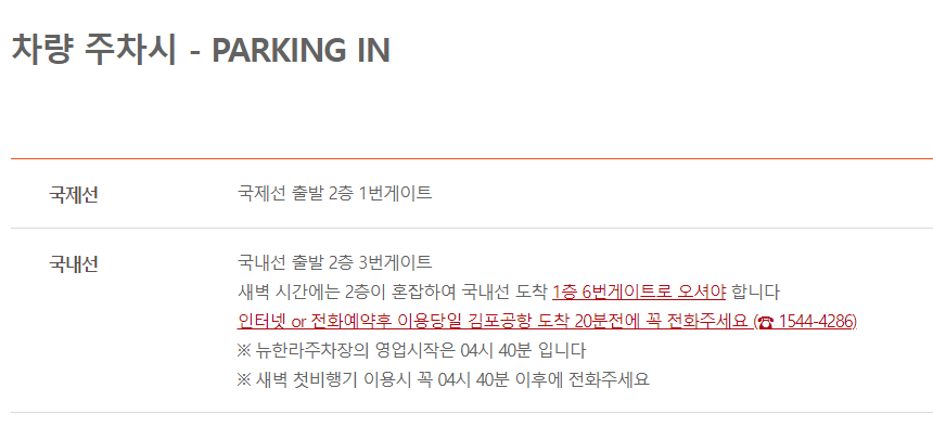 - 차량 주차 시 국내선 출발 2층 3번게이트 (도착 20분전 1544-4286 전화 필요)