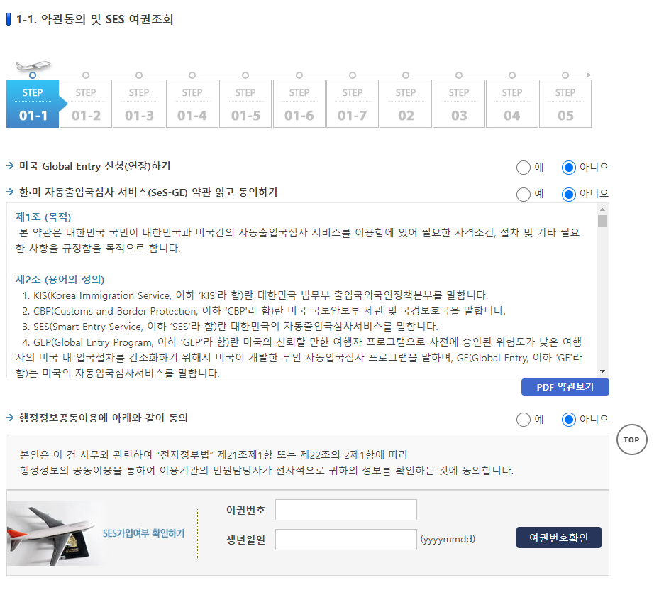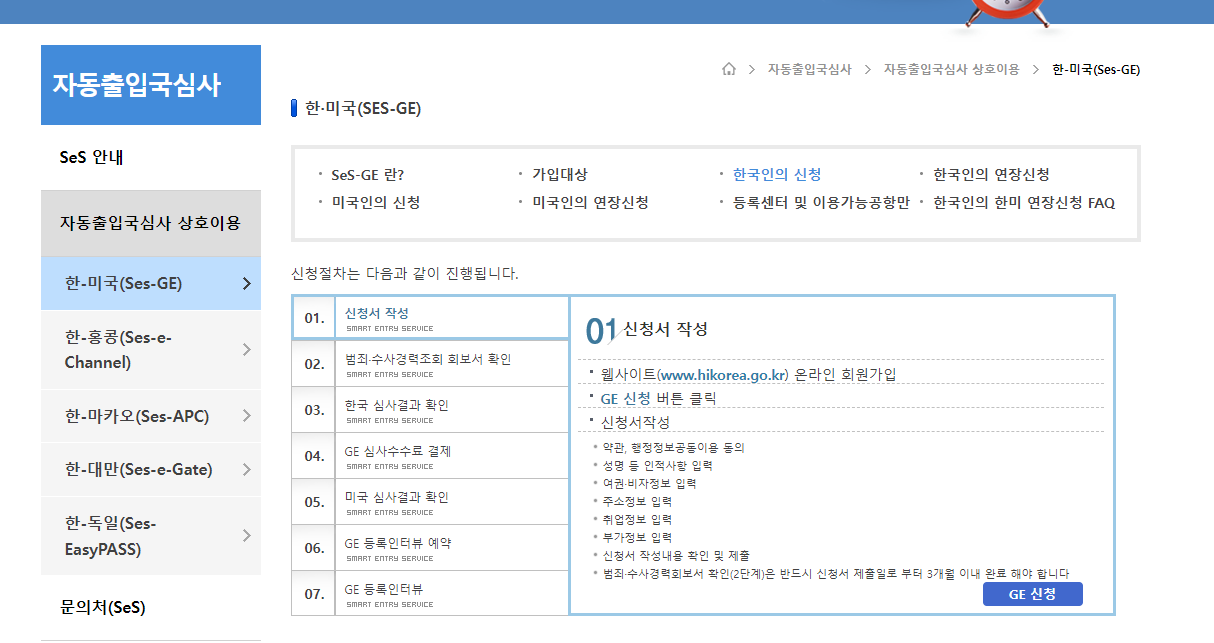 파란색 GE 신청을 누르면 아래와 같이 STEP 01-1 ~ 01-6 작성 Form이 나타납니다.