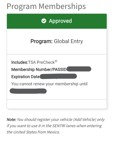 인터뷰 이후 조회해 보면 Approved로 뜨며 Mebership 번호와 Expiration Date 확인 가능합니다. Global Entry 승인이 되면 별도 신청 없이 TSA Pre-Check를 사용할 수 있습니다. G.E 유효기간은 본인의 생년월일 기준으로 5년이 나옵니다.