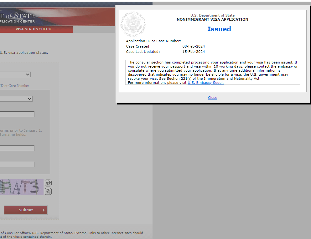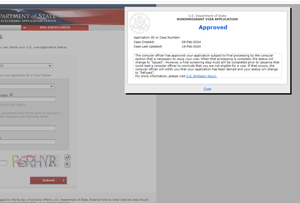 - 2/8일(목):비자 인터뷰 (그린레터 수령), CEAC 비자 Status 조회 시 Refused로 뜸