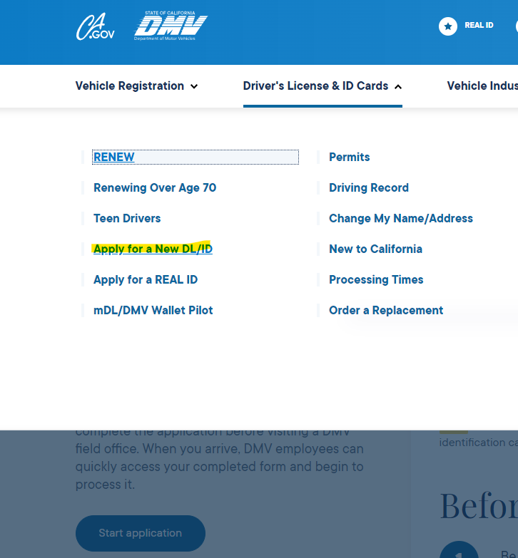 Driver License & ID Cards 메뉴에서 "Apply for New DL/ID"를 클릭하고 Start Application을 클릭합니다.