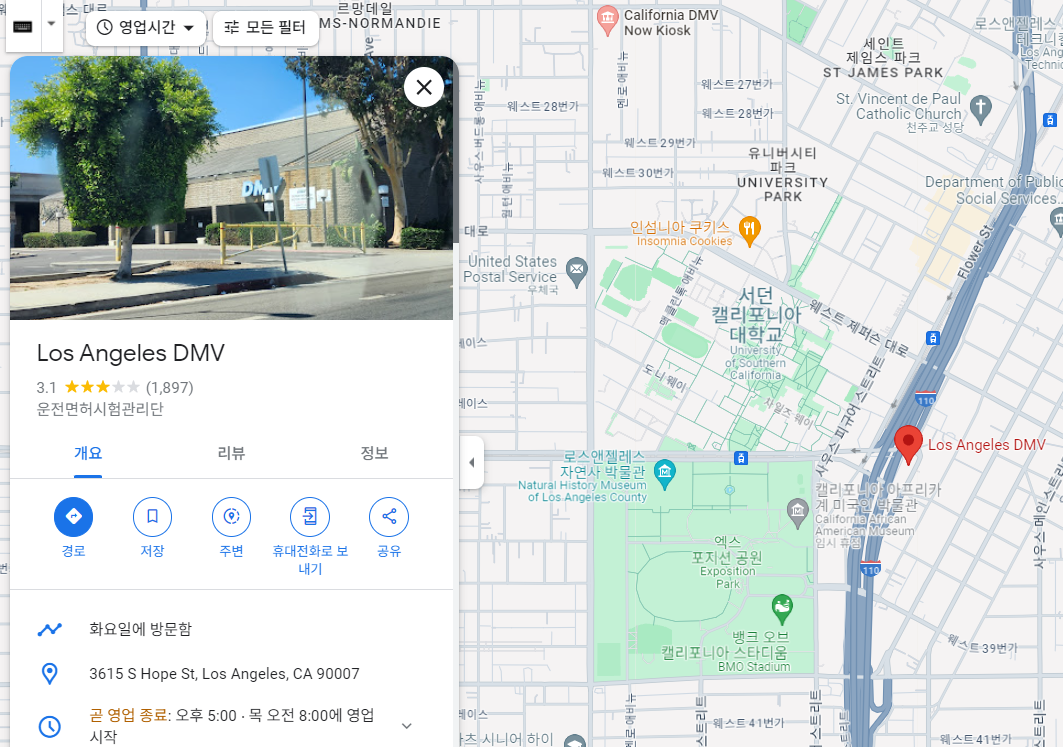 저는 LA DMV를 방문하였고 주소는 3615 S Hope St, LA, CA, 90007입니다. Appointment를 하지 않았을 경우 아침 8시부터 오픈이니 그 전에 가서 줄 서시는 것을 추천합니다.