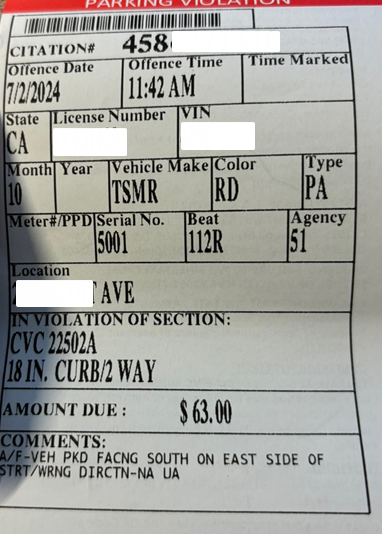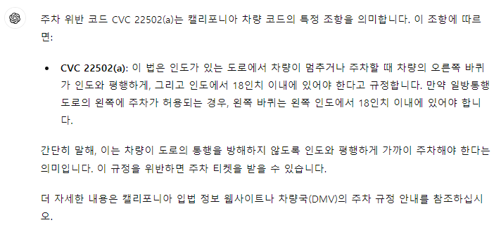 CHAT GPT에게 찾아보니 주차를 할때 연석에서 18인치 이상 떨어지면 안되는데 차를 바짝 붙이지 않아 벌금이 나온 것이다.