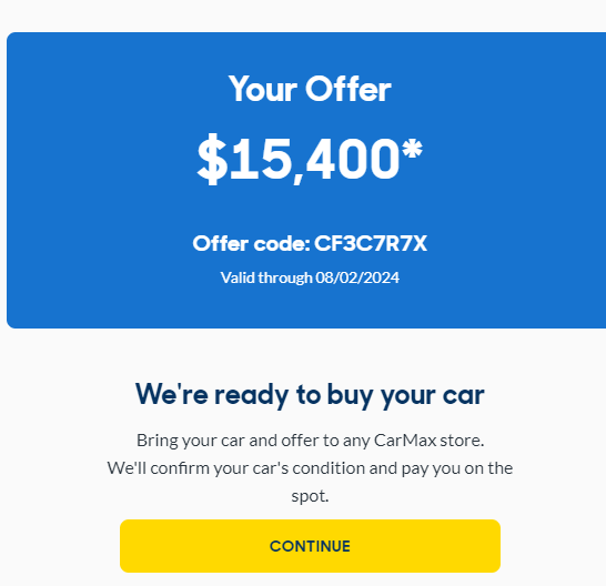 carmax 전문 엔지니어가 차량 상태를 점검하고 한시간 정도 대기하면 아래와 같이 견적서를 뽑아줍니다. 차량 상태외에도 차량 Title, Registration을 토대로 할부 남은것은 없는지 보험이력이나 전체적인 차량 상태에 대해 카맥스에서 조회합니다.