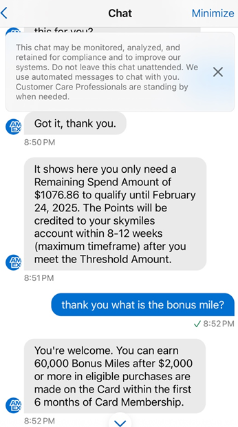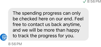 AMEX 모바일 어플 CHAT 기능을 활용하면 됩니다. 아래와 같이 Bonums mile과 현재까지 사용한 금액을 확인해달라고 하면 바로 chat으로 답변을 해줍니다. Chat은 상담원과 실시간으로 연결되니 대기 시간 없이 바로 확인 가능합니다.