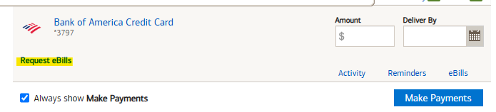 크레딧 카드 오토페이 셋업 핵심은 Bill Payment E-Bill을 활성화 시키는 것 입니다. (이 화면이 직관적이지 않아 많은 사람들이 헤매는 것 같습니다.)