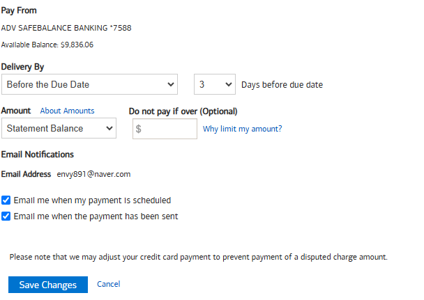 Autopay 화면에서 저는 Due Date 3일전, Amount는 State Balance로 설정하였습니다. Save Change