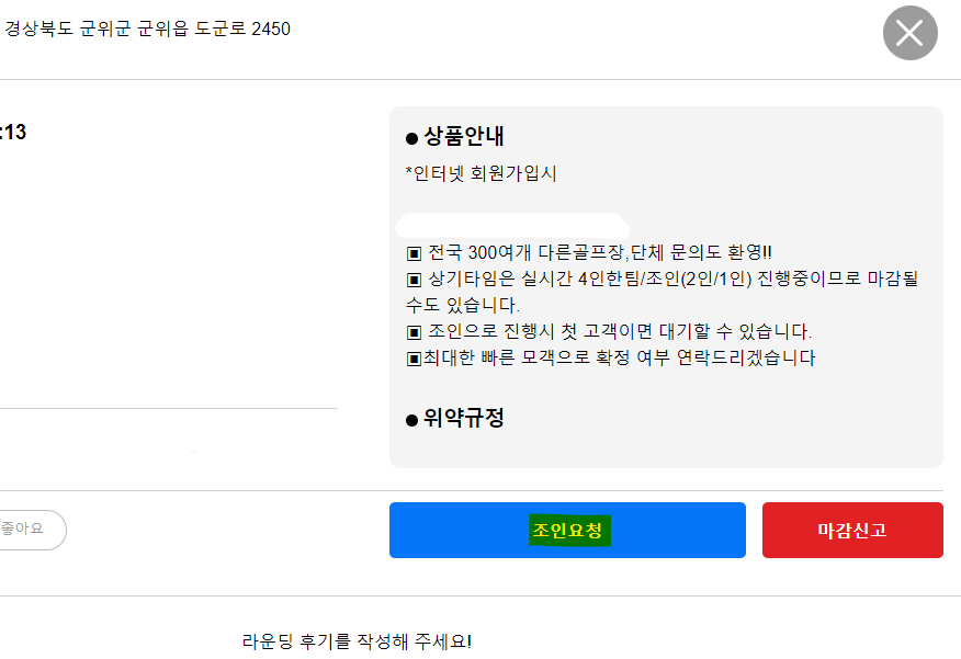 예약 가능한 골프장이 쭉 나오고 그린피/티업시간 등을 보고 마음에 드는 예약을 클릭하면 됩니다. 그러면 아래와 같이 부킹매니저의 전화번호가 나오고 "조인 요청"이 가능합니다. 조인 요청을 누르면 담당자에게 텍스트 메세지가 발송됩니다.