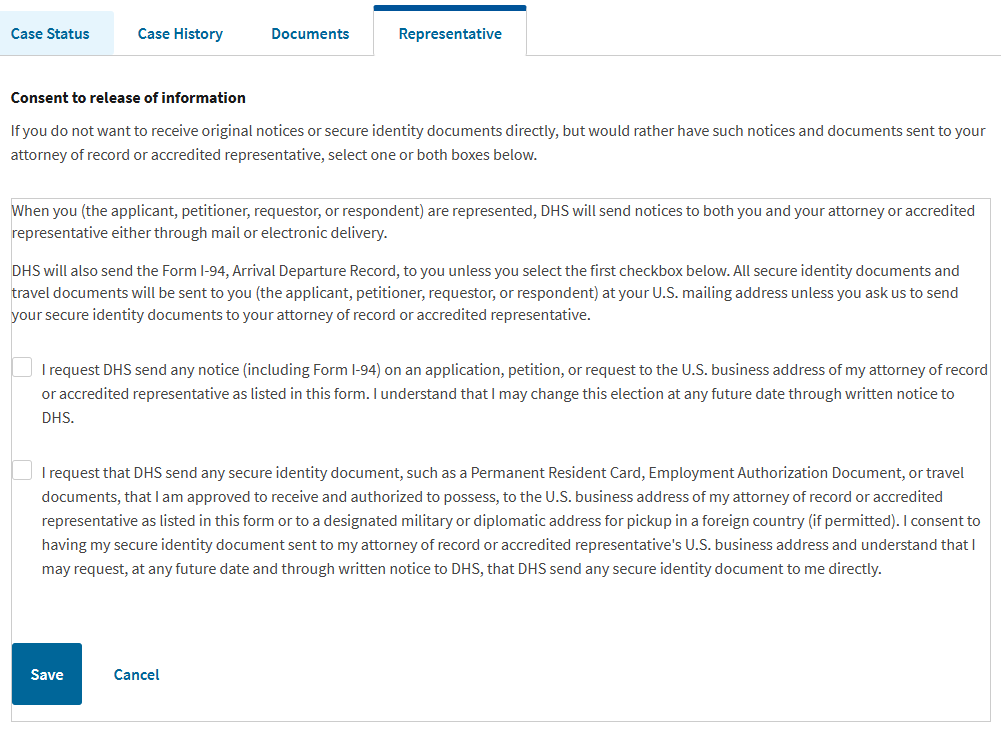 변호사가 서류 분실의 위험으로 변호사 사무실로 그린카드를 수령하도록 설정할 수 있습니다. 만약 변호사 사무실로 가길 원하지 않고 직접 집 주소로 받길 원하면 USCIS Website Representative tab에서 체크를 해제하면 됩니다. Approval이 나기 전에 해야 집 주소로 배달 됩니다.