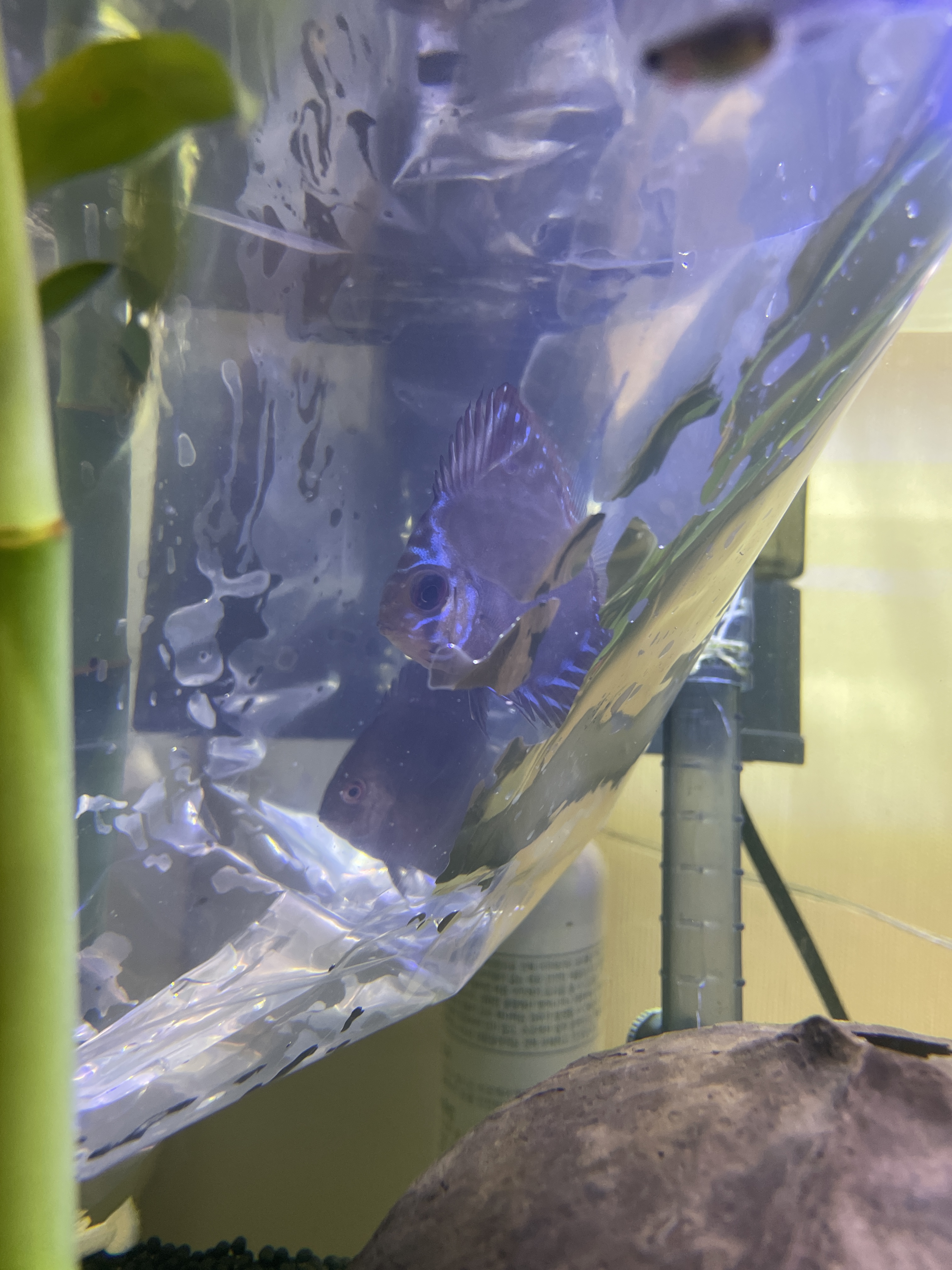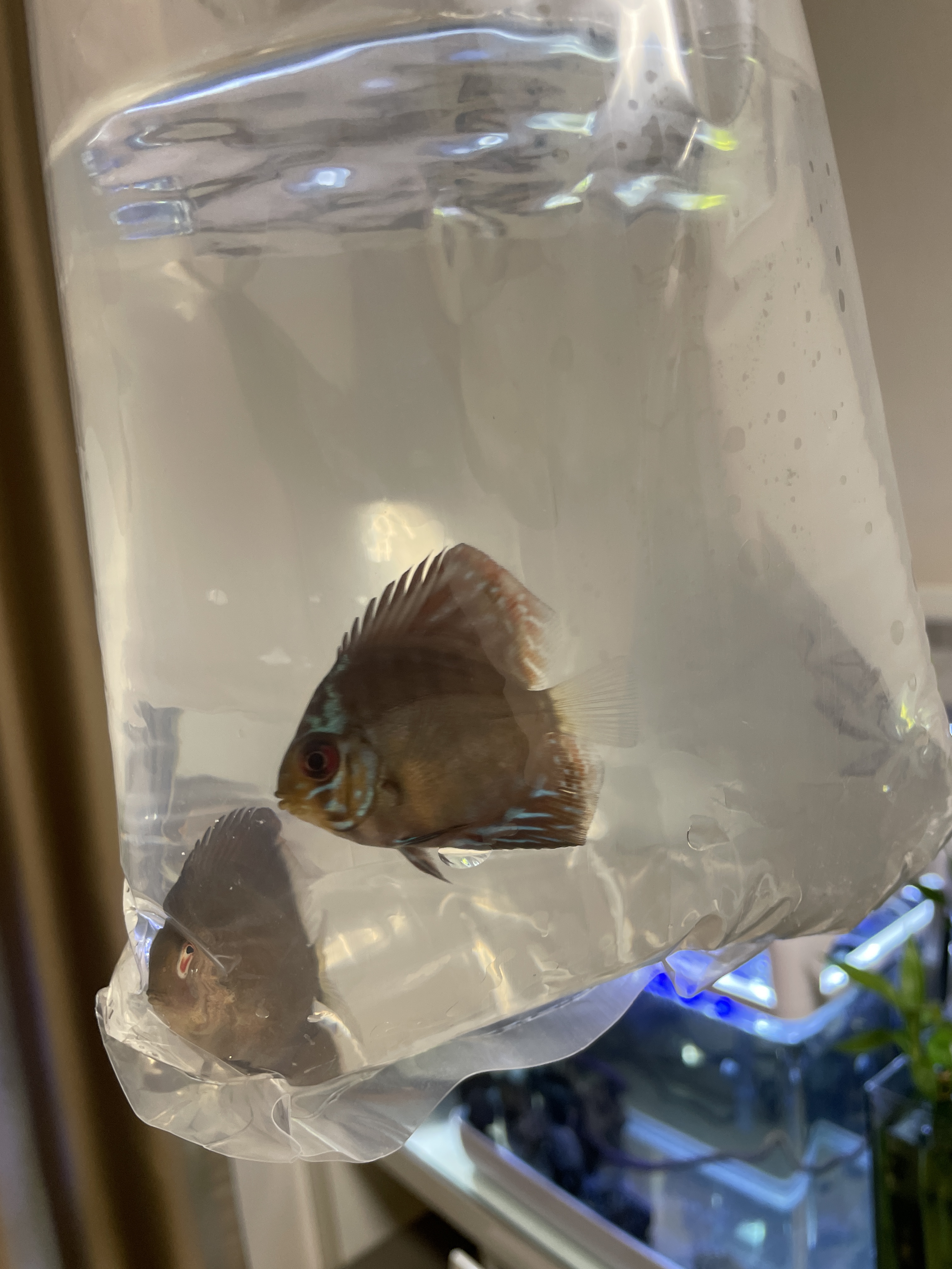 처음 베타로 물 생활을 시작하여 구피들을 키우고 있는데 이번에 간 아쿠아 카페에서 디스커스를 보고 난 후 디스커스에 빠져서 홀린듯이 구매하였습니다. 집이 좁아서 어항을 더 늘리면 안되는 상황이긴 한데 그래도 이전에 쓰던 어항도 있어서 디스커스 유어 2마리를 인터넷으로 주문하였습니다.