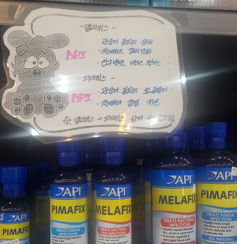 약품 구입: 멜라픽스 & 피마픽스 2가지 약품만 있으면 충분하다고 합니다. 2가지를 보통 섞어서 사용하는데 천연재료로 만들어져 물고기들에게 큰 자극을 주지 않는다고 합니다.