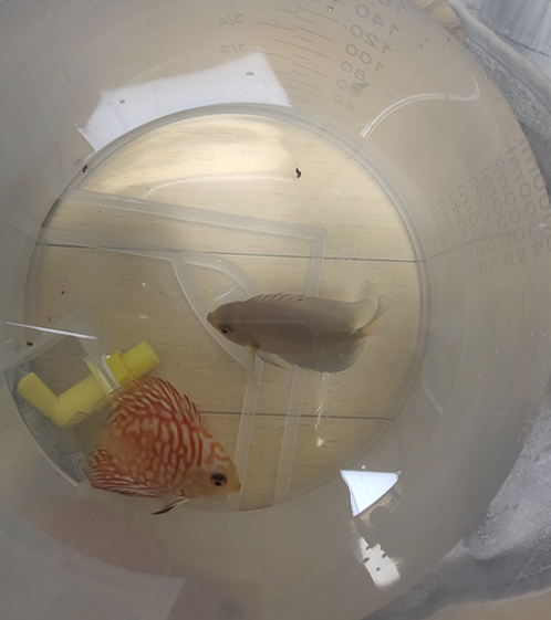 수족관에서 가져온 디스커스를 수족관 물과 함께 환수통에 넣어주었습니다. 기존 설치된 어항 물과 조금씩 섞고 1시간 정도 지나 어항에 넣어주려고 합니다.