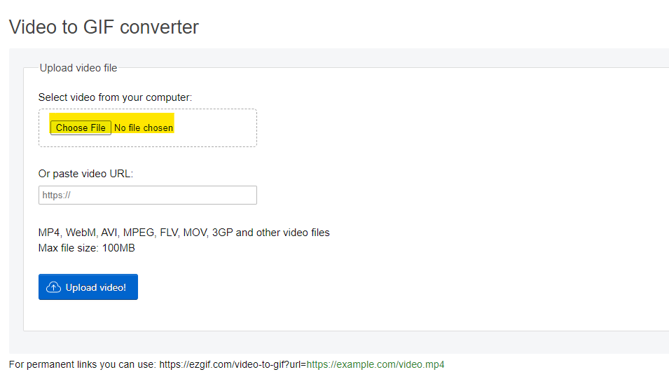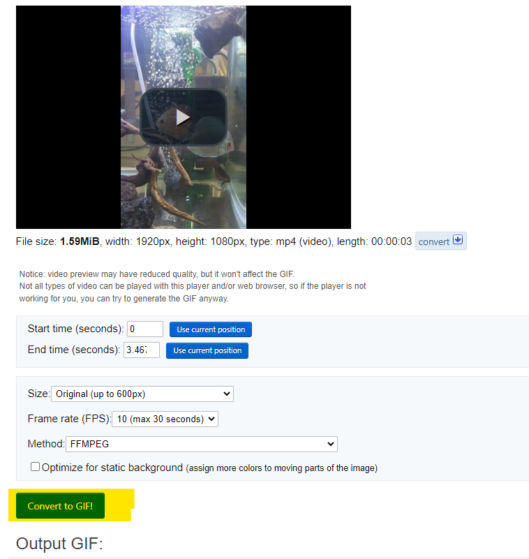 Upload your video, select the part you want to convert and instanlty create a GIF in good quality for free and without watermarks.