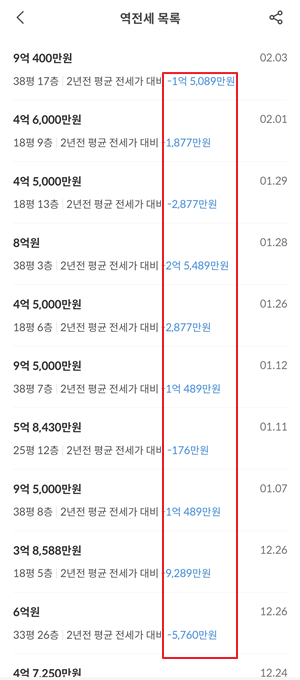 호갱노노에서 역전세 기능을 통해 2년전 평균 전세가 대비 얼마나 하락하였는지 볼 수 있습니다. 평수가 클 수록 하락율이 큰 것으로 나타납니다. 올해 하반기부터 본격적으로 도래하는 역전세가 헬리오시티 매매가에 어떤 영향을 끼치게 될지 지켜보면서 매수타이밍을 잡아보려고 합니다.