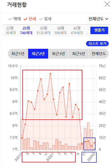 헬리오시티의 단기간내 가장 큰 악재로 손꼽히는 것은 역전세 이슈 입니다. 전세가가 가장 상승했던 시기는 2021년 하반기 ~ 2022년 하반기로 25평 기준 8.5억 ~ 10억에 전세가가 형성되었고 올해 하반기부터 고가의 전세 만기가 도래합니다. 현재 전세가는 7억원 수준이며, 월세 물량도 꽤 많이 나오고 있습니다. (전세 만기가 도래하는 시점에 임대인은 약 1~3억의 전세금 차이를 임차인에게 돌려주어야 합니다)