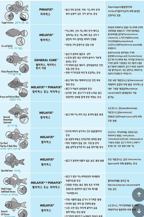 멜라픽스, 피마픽스는 근처 수족관에서 쉽게 구매할 수 있습니다. 천연성분으로 구성되어 있어 물고기에 큰 자극이 가지 않는다고 합니다. 안구백탁은 멜라픽스, 지느러미, 꼬리 녹음 등에 피마픽스를 사용하는데 자세한 내용은 아래 이미지를 참고하시면 가장 좋을 것 같습니다. (제조사에서 만든 자료입니다.)