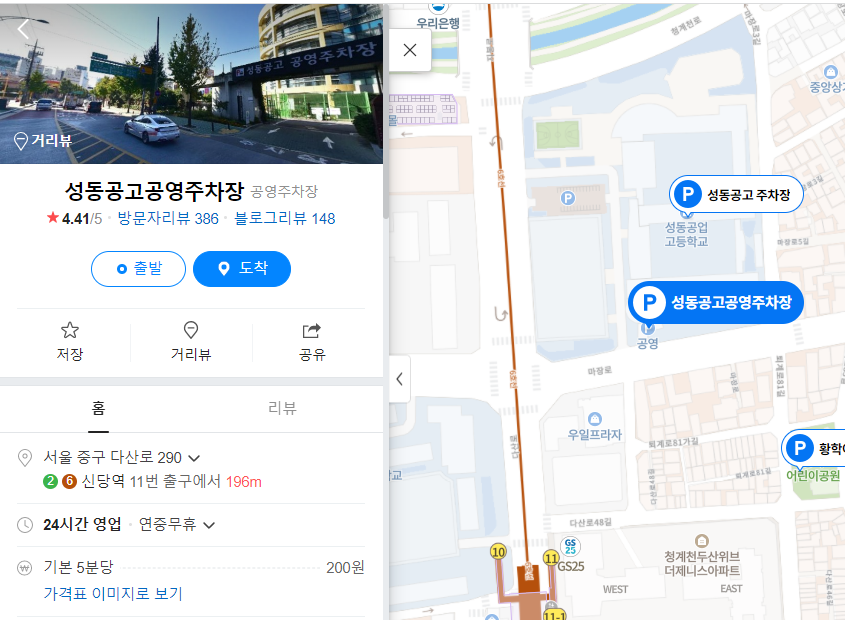 성동고공영주차장은 주차공간이 꽤 넓고 5분에 200원으로 시간당 2,400원 수준입니다. 여기서 편하게 차를 주차하고 수족관 거리는 도보로 약 5~10분 정도 소요 됩니다.