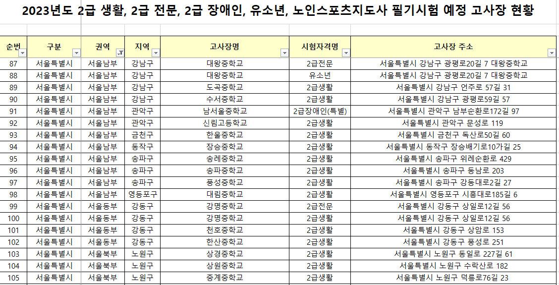 홈페이지에 전체 엑셀파일로 시험 응시 가능한 전체 고사장 확인이 가능합니다. 아래 링크로 가시면 다운 받을 수 있습니다.