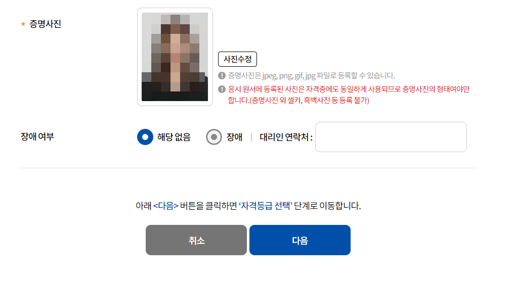 아침 9시에 접속하니 접속자가 많아 12시까지는 지연이 있었는데 지금은 원활하게 접속이 됩니다. 아래 필기시험 접수 신청 화면으로 가시면 회원 가입시 입력한 정보가 나타나고, 증명사진 등록이 필요합니다.