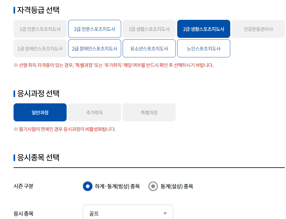 2급 생활스포츠지도사를 클릭하고 원하는 종목을 선택하면 됩니다. 저는 골프로 응시하였습니다. (참고로 필기 시험은 종목 상관 없이 동일합니다.)