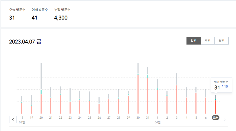 방문자수는 포스팅을 하지 않은 날도 30~50명 정도로 최소 30명 정도는 꾸준히 유입되고 있습니다.