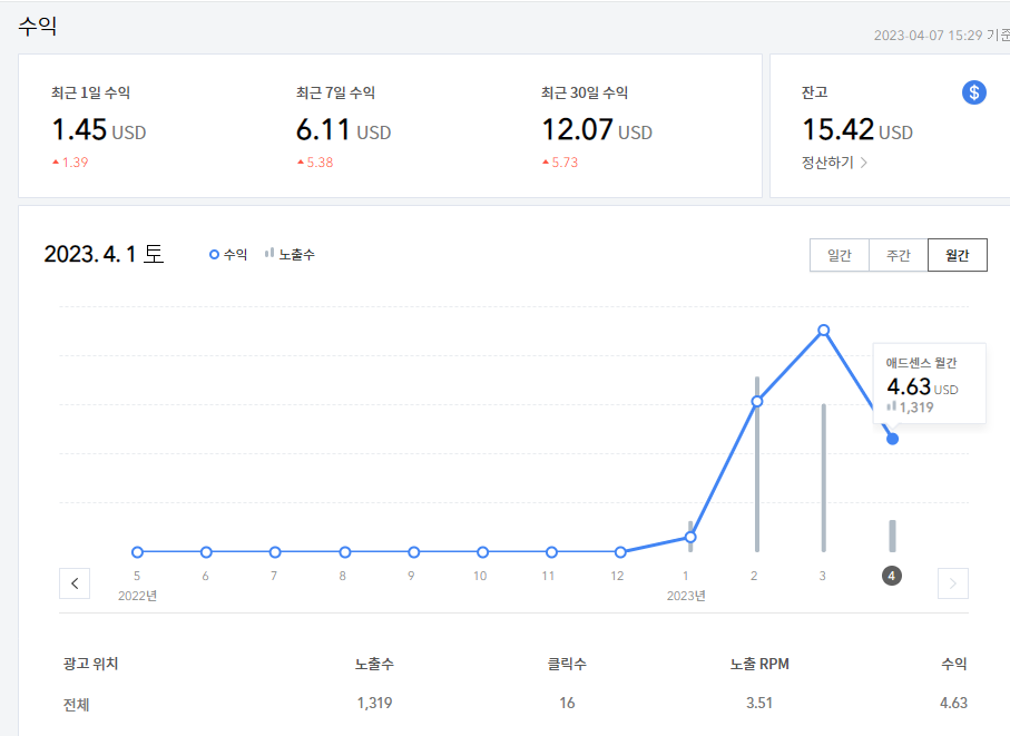 | 티스토리 애드센스 승인 후 운영 수입, 후기 (7) | 2023.02.07 |