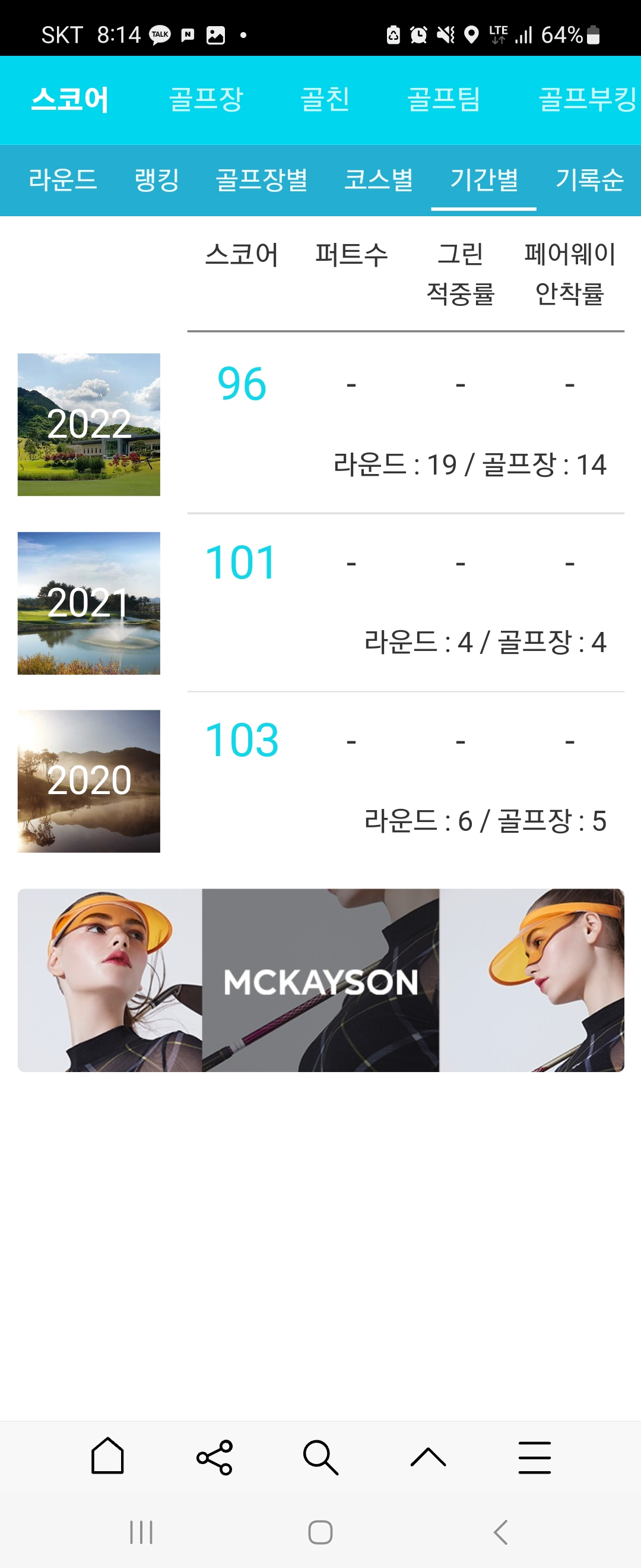 처음 시작할 때 아무래도 스코어를 정확히 세지 않다 보니 실제 실력 보다는 낮은 스코어로 기록되었습니다. 필드 나가면 아직 숏게임이 부족해서 아주 잘치면 80대 후반, 평균적으로는 90대 중후반을 치는 것 같습니다.