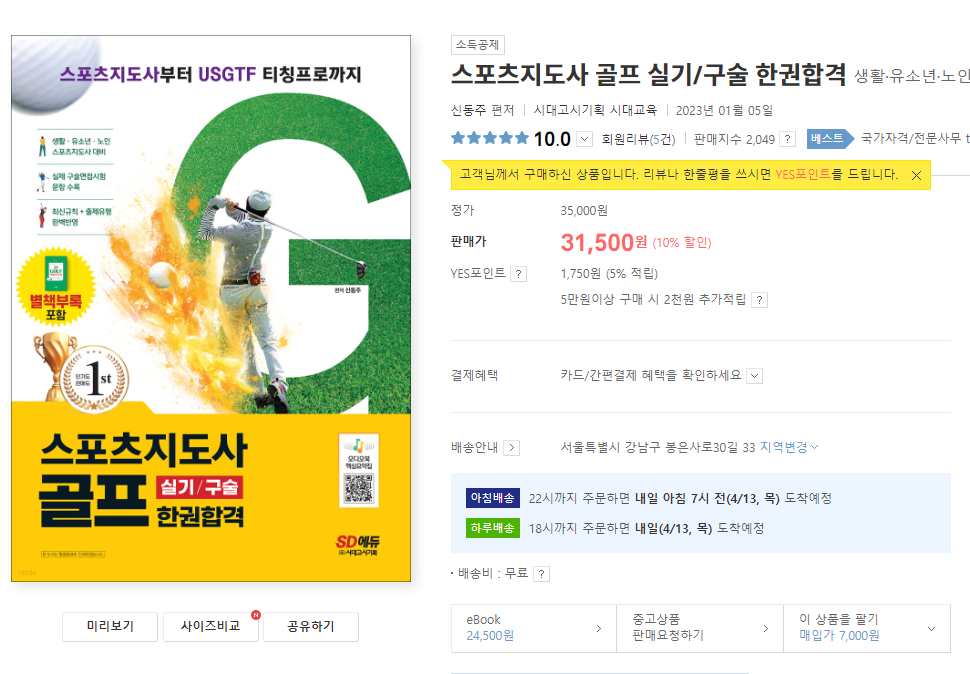 스포츠지도사 골프 구술이 생각 보다 난도가 있다고 하여 대략적으로 내용 파악할 겸 교재를 구매하였습니다.