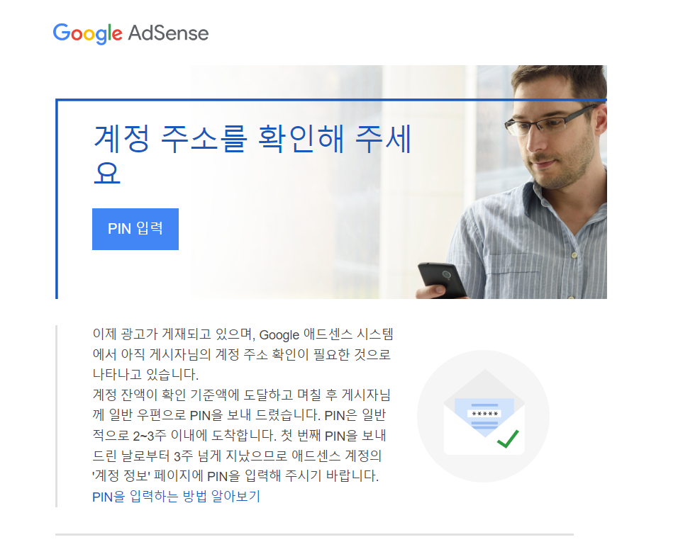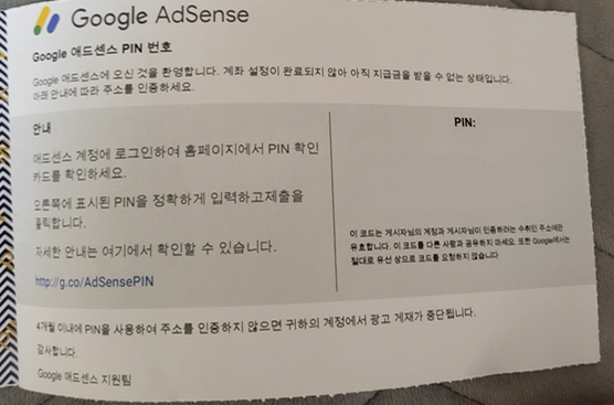 블로그를 운영하고 시간이 흐르면 아래와 같이 계정 주소를 확인해달라는 메세지가 뜹니다. 본인이 설정한 주소(한국 주소지)로 PIN이 오는데 저의 경우 약 2달 정도 시간이 소요되어 제 경험담을 공유 드리려고 합니다.