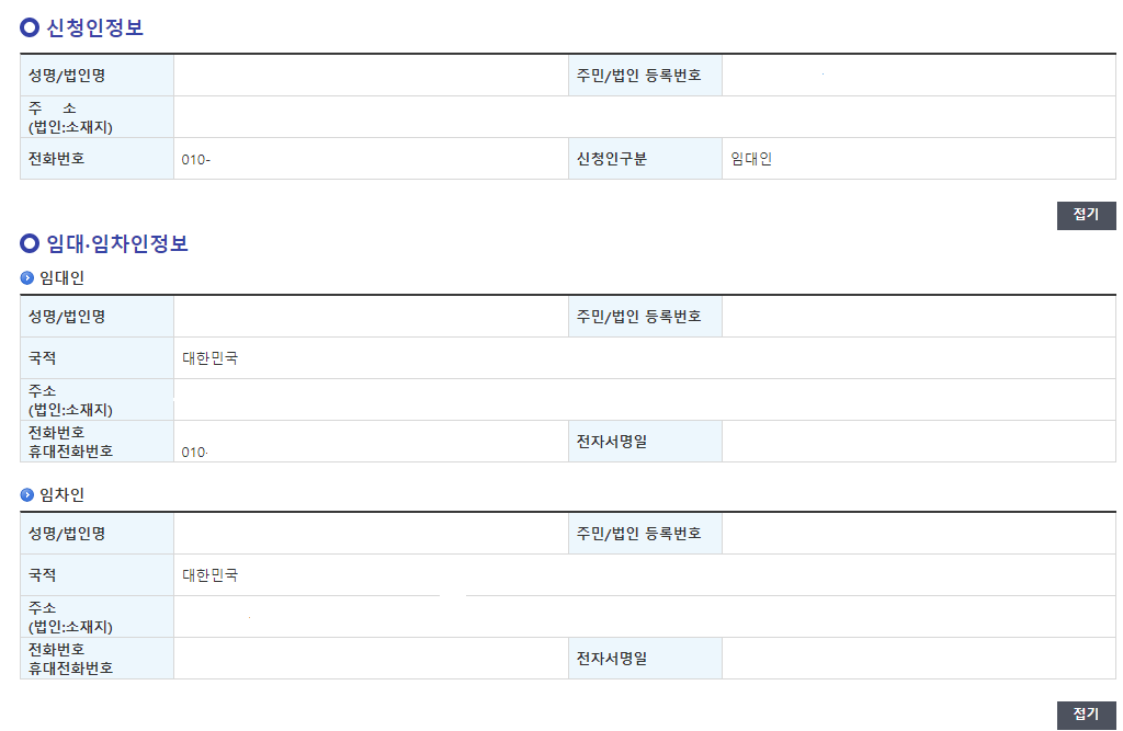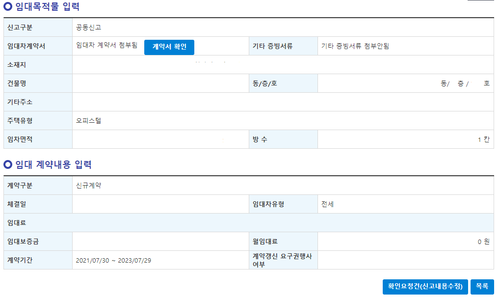 신청인 정보는 개인정보로 모두 지운 상태이나, 계약서와 동일하게 꼼꼼히 입력하셔야 합니다. 입력이 완료되면 제출을 하면 담당 공무원이 리뷰 후 승인을 해야 완료됩니다.