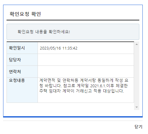 신고 후 1시간 내에 "주택임다채 신고이력 조회"를 해보니 "확인 요청"으로 나왔고 담당 공무원이 수정 필요한 부분을 보내줍니다. 계약서 내용과 다르게 입력된 것이 있으면 수정이 필요하니 처음 등록할 때 꼼꼼히 확인해 주세요.